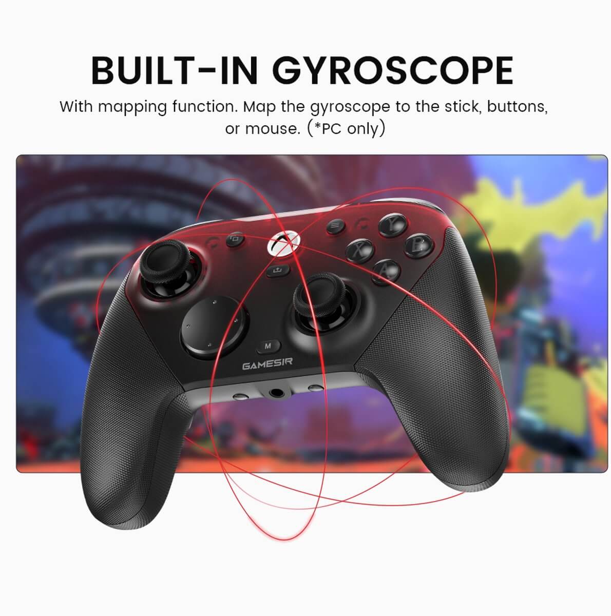 Twee mini-bumpers (R5/L5) en twee vergrendelbare achterknoppen (R4/L4). Ingebouwde gyroscoop met stick/knop/muis-mapping op PC.
