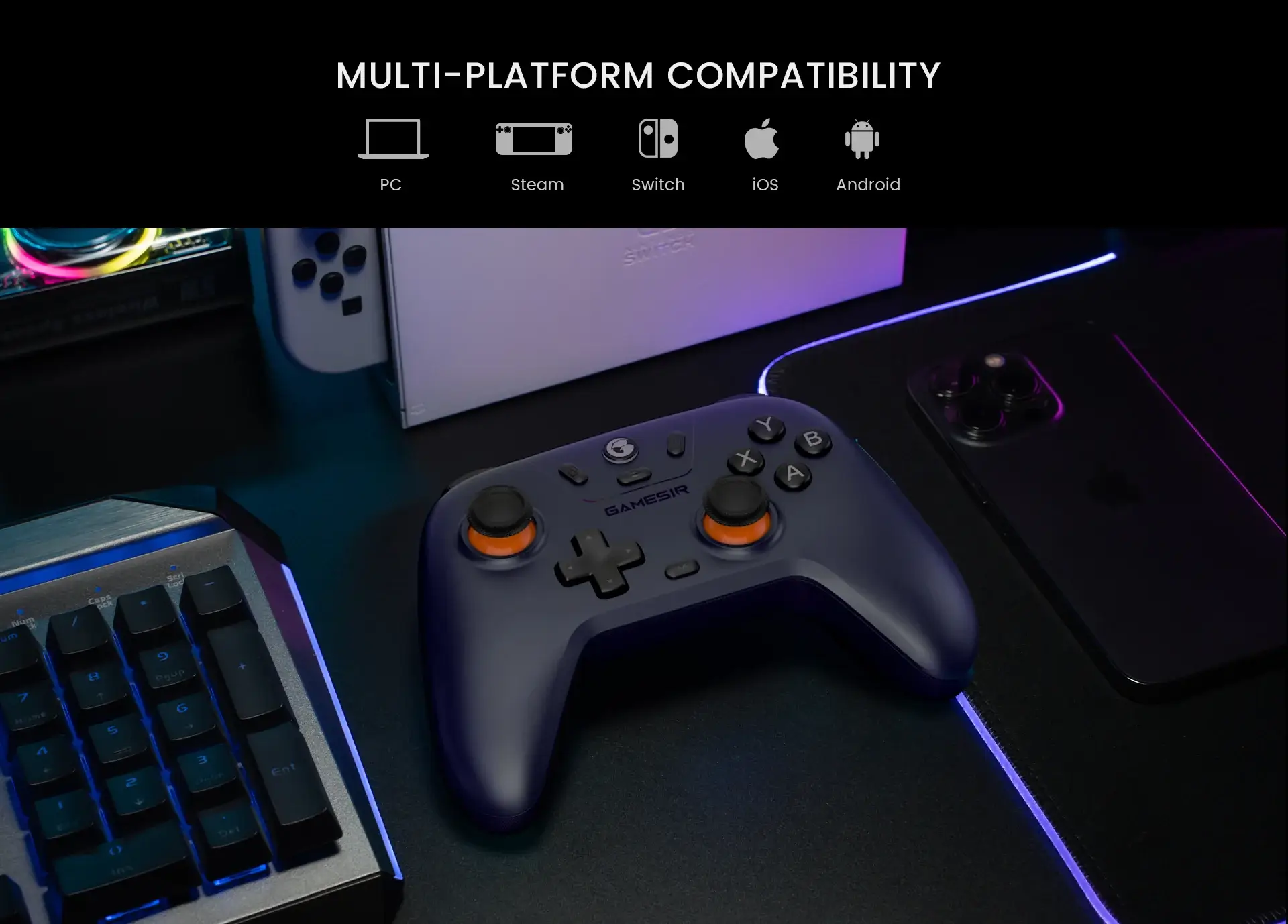 Gamesir Nova Lite biedt gamersflexibiliteit met drie connectiviteitsopties: Bluetooth, Wireless Dongle en USB-C. Met deze veelzijdigheid kunt u eenvoudig schakelen tussen apparaten voor naadloze gameplay op verschillende platforms. Compatibel met desktops, Steam, Nintendo Switch-platforms, evenals iOS- en Android-apparaten, maakt de Gamesir Nova Lite echte platformonafhankelijke gameplay mogelijk, waardoor vertraging wordt geminimaliseerd en ervoor zorgt dat elke game soepel verloopt.