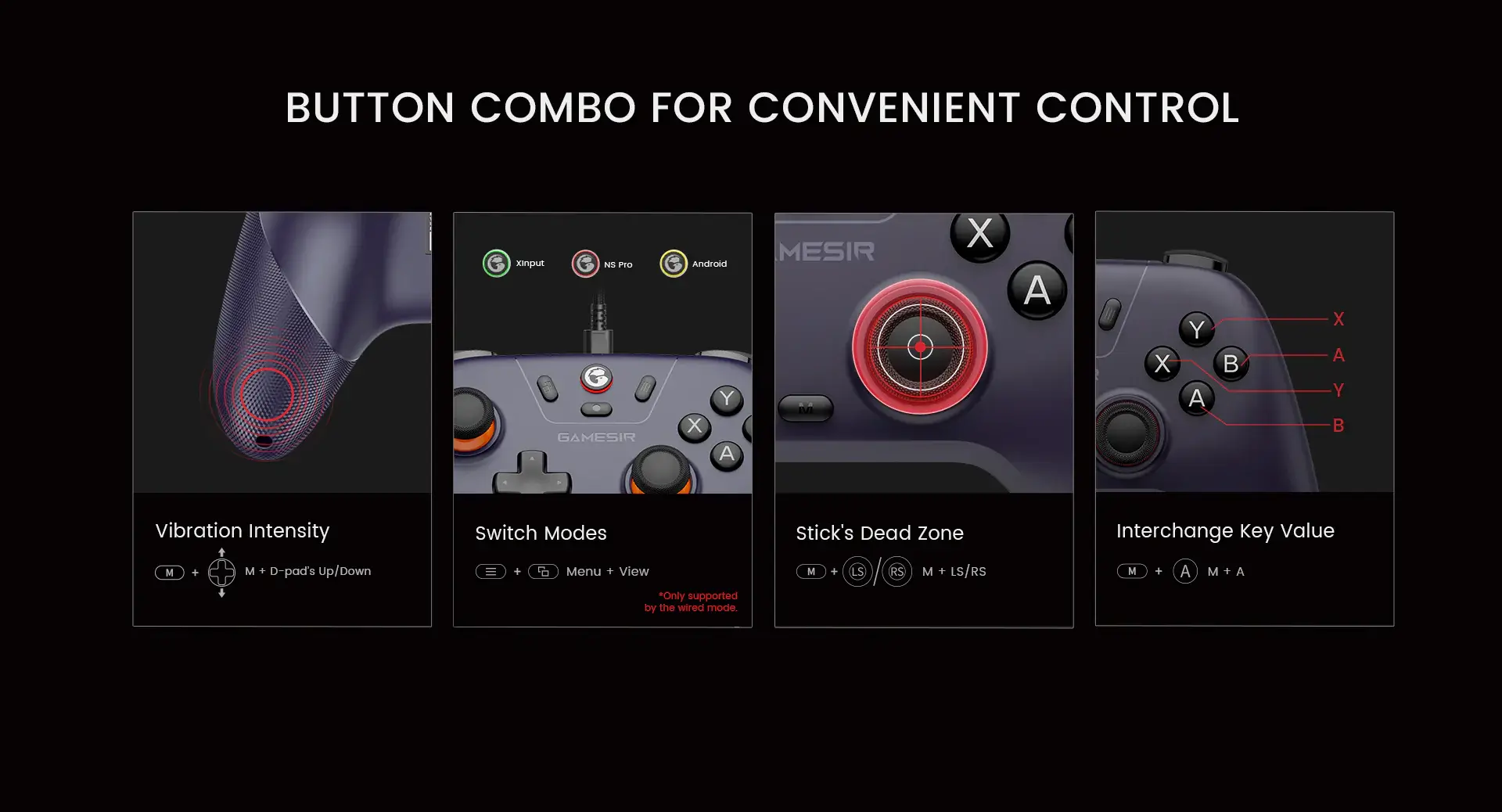 Gamesir Nova Lite -controller is uitgerust met een 20 Hz turbo -functie met aanpasbare knoppen, inclusief A/B/X/Y/LB/LT/RB/RT, waardoor gamers kunnen genieten van nog meer dynamische gameplay. De mogelijkheid om de Turbo -functie in of uit te zetten met een enkele knop (M) biedt gemak en reactievermogen tijdens intense gamingmomenten. Bovendien maakt de M -knop een eenvoudige aanpassing van verschillende instellingen mogelijk, zoals trillingsintensiteit, ABXY -sleutellay -out en stokdode zone, waardoor gamers volledige controle krijgen over hun voorkeuren.
