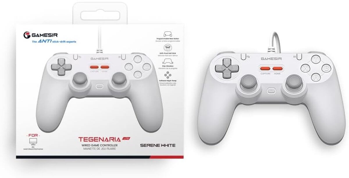 De GameSir T3 Tegenaria Lite is een bedrade game controller met retro-design, Hall Effect sticks, 1000 Hz polling rate en dubbele trilmotoren. Geschikt voor PC, iOS, Android en Switch.