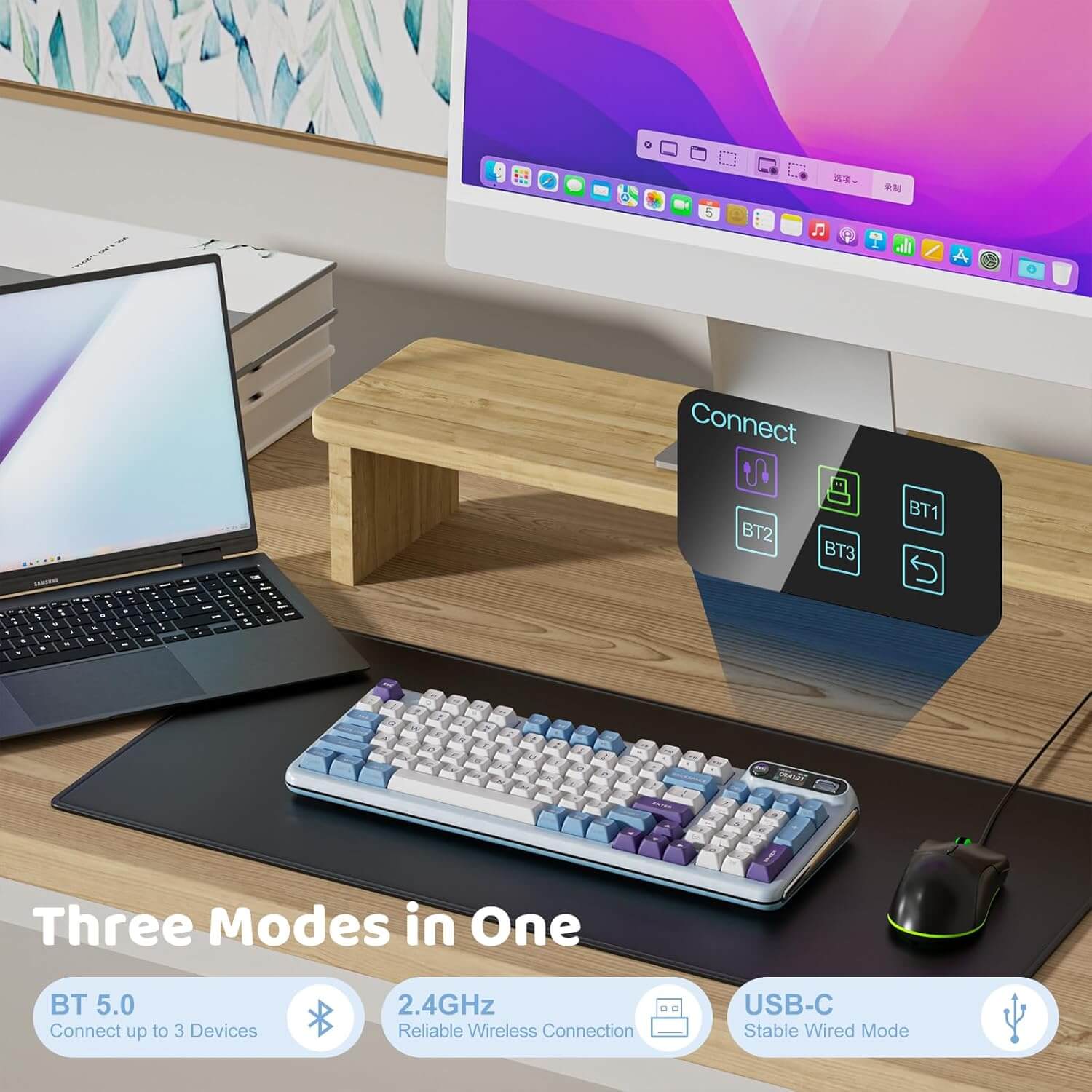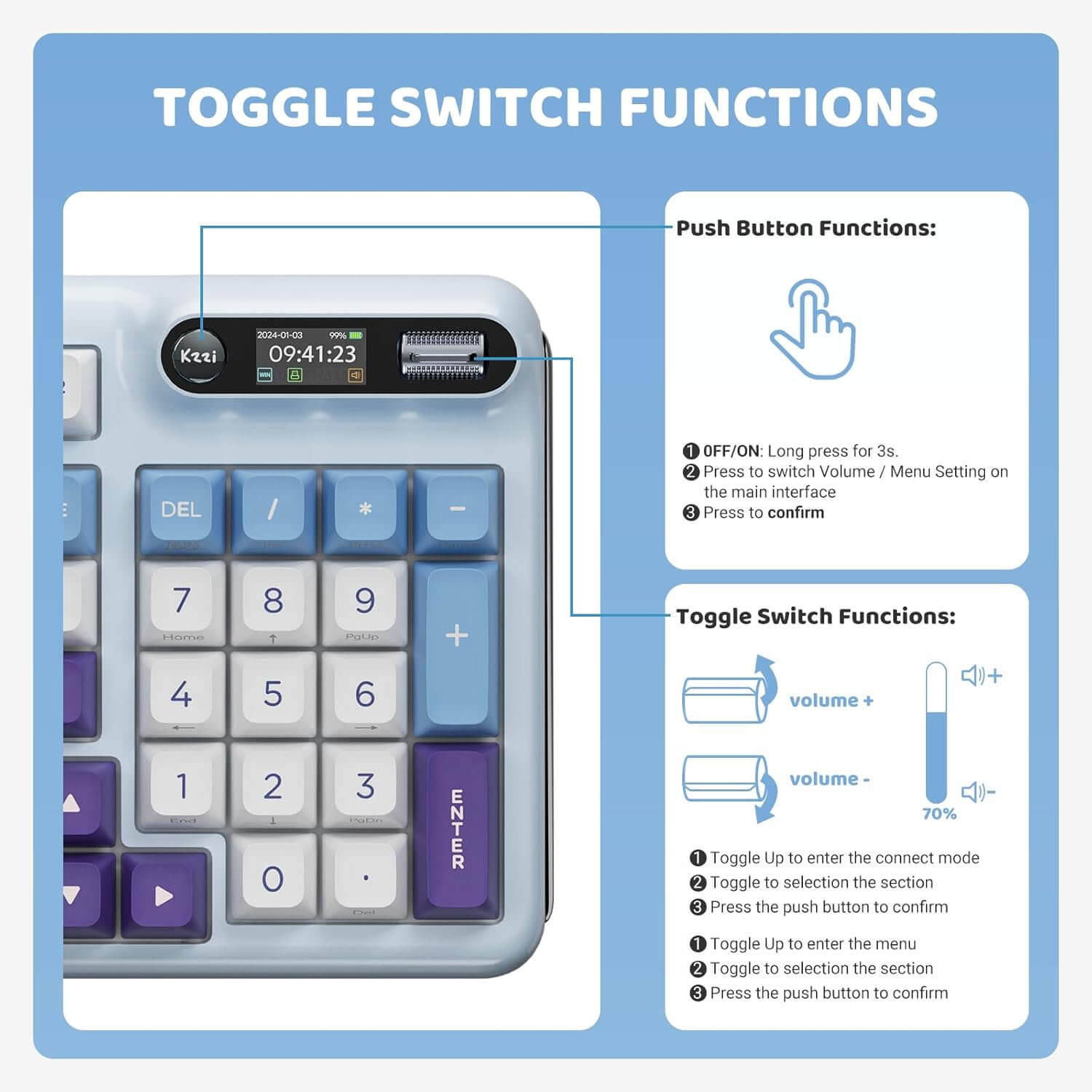 Innovatief Smart Display & Draaiknop: Verbeter je type- en game-ervaring met het draadloze mechanische toetsenbord van KZZI. Met een geavanceerd scherm en een ingebouwde driewegdraaiknop kun je eenvoudig systeeminformatie bekijken en toetsenbordinstellingen in één oogopslag aanpassen. Toon bovendien je eigen stijl door aangepaste GIF’s, zoals je favoriete huisdier, rechtstreeks op je toetsenbord weer te geven.