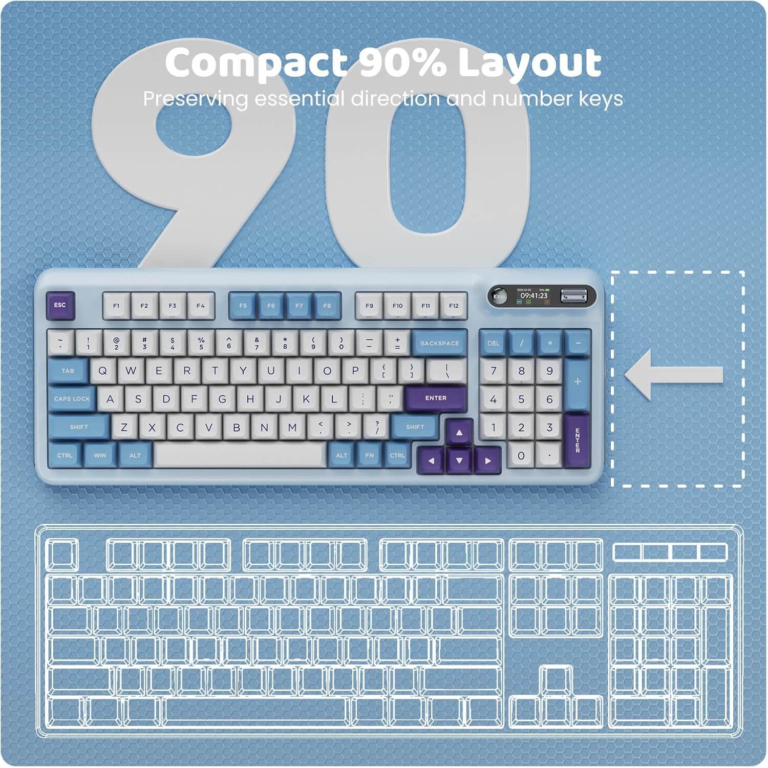 Ruimtebesparende lay-out van 90%: Het mechanische KZZI Z98 toetsenbord is ontworpen voor efficiëntie en heeft een lay-out van 90% met 94 toetsen, waardoor essentiële richtings- en cijfertoetsen behouden blijven en waardevolle bureauruimte wordt bespaard. Dit compacte, draadloze gamingtoetsenbord is perfect voor iedereen die een strakke opstelling wil zonder in te leveren op functionaliteit.