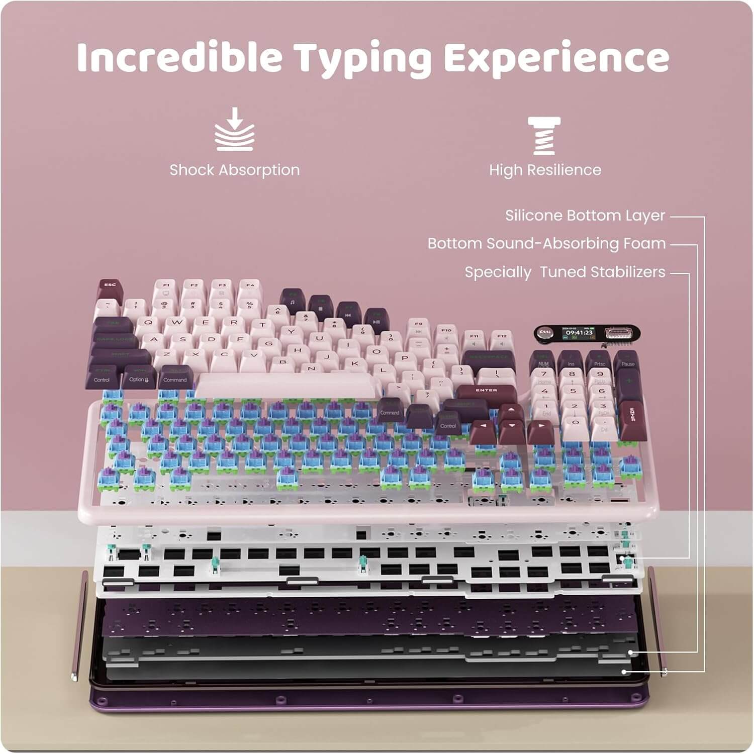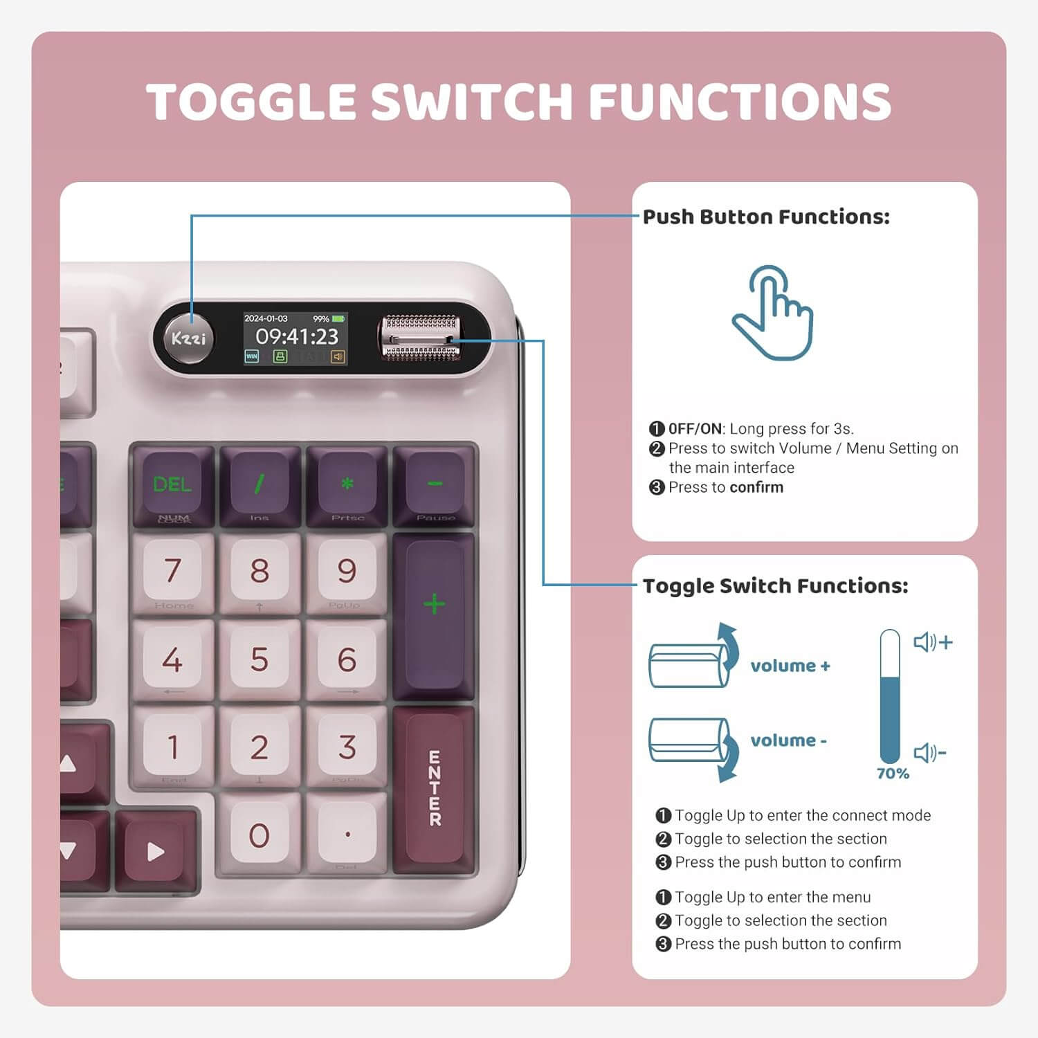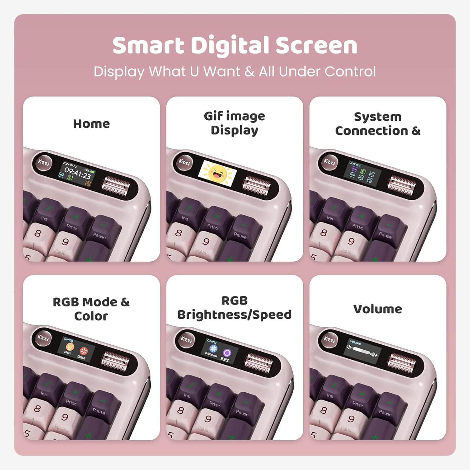 Innovatief Smart Display & Draaiknop: Verbeter je type- en game-ervaring met het draadloze mechanische toetsenbord van KZZI. Met een geavanceerd scherm en een ingebouwde driewegdraaiknop kun je eenvoudig systeeminformatie bekijken en toetsenbordinstellingen in één oogopslag aanpassen. Toon bovendien je eigen stijl door aangepaste GIF’s, zoals je favoriete huisdier, rechtstreeks op je toetsenbord weer te geven.