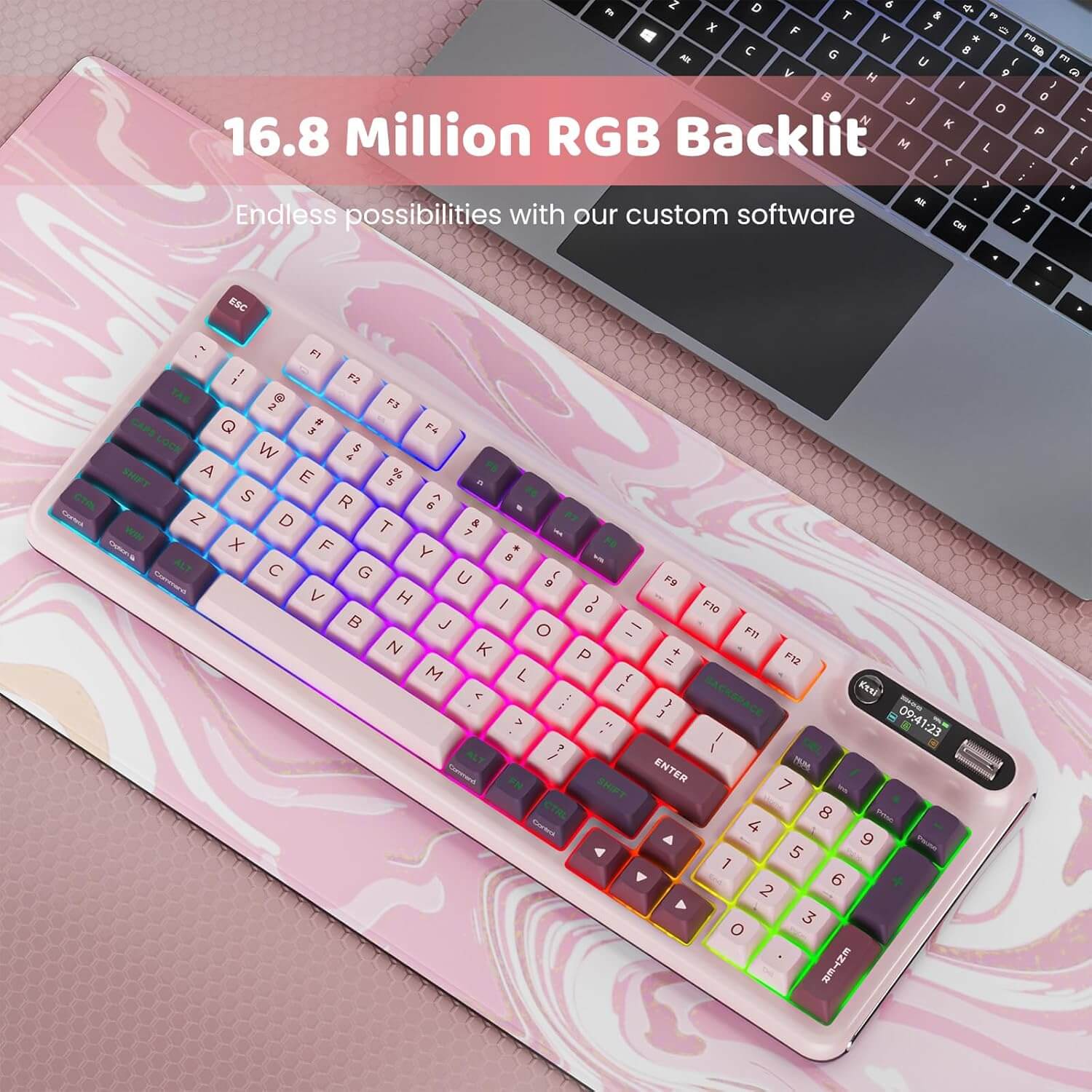 Draadloos mechanisch toetsenbord, slim display en draaiknop, BT5.0/2.4GHz/USB-C, hot-swappable custom toetsenbord, voorgesmeerde lineaire switches, pakkingmontage, RGB Creamy gaming toetsenbord