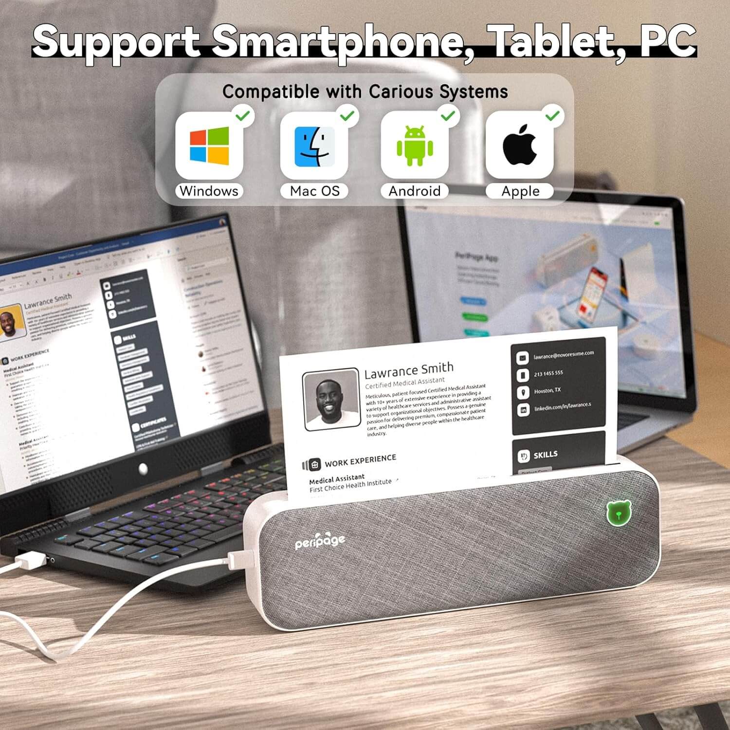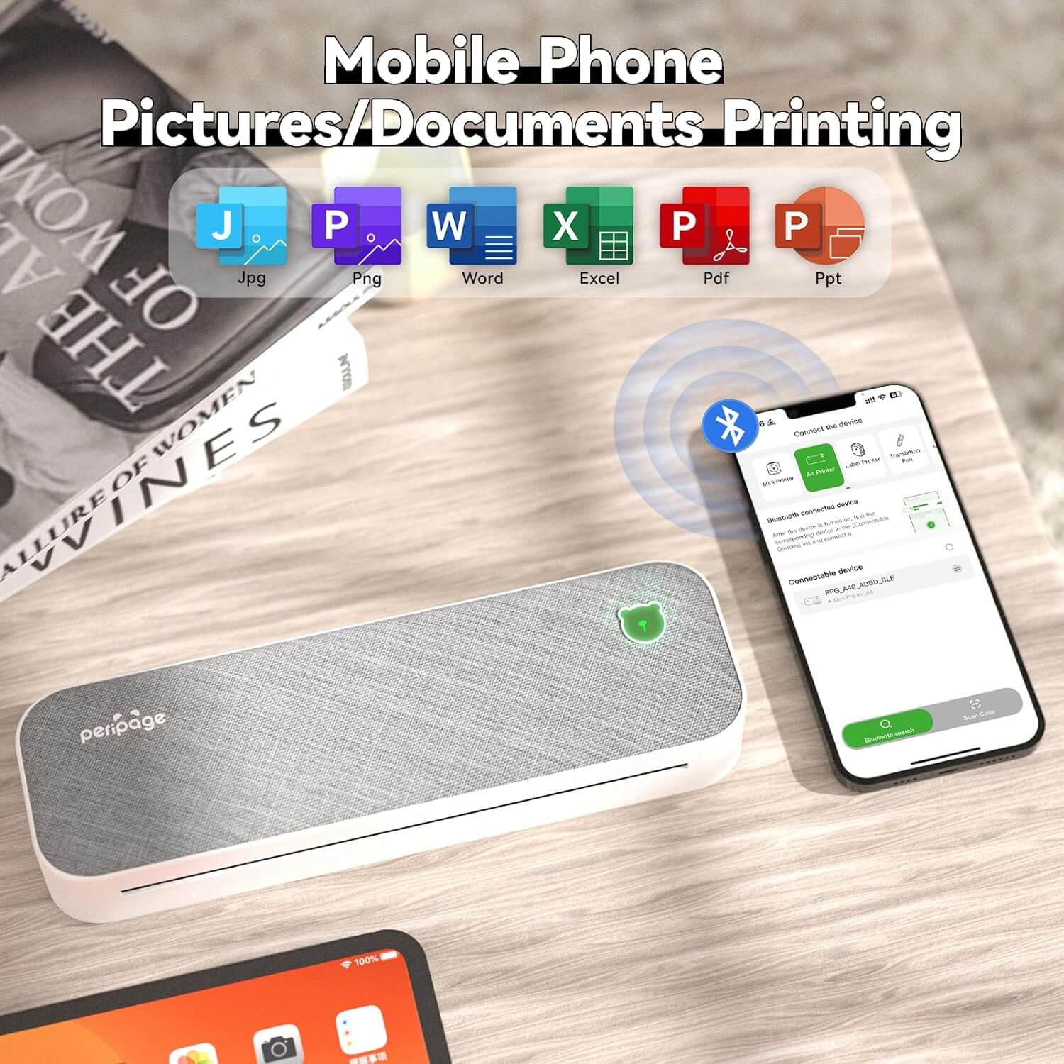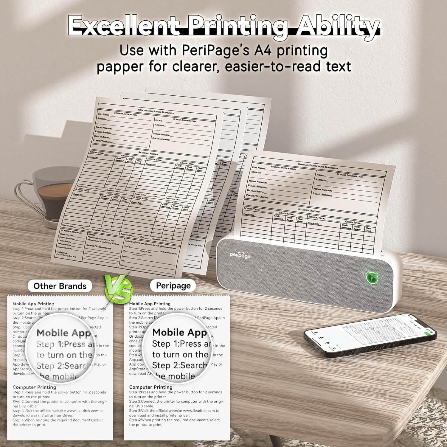 De PeriPage A40 is een draagbare thermische A4-printer met Bluetooth, 203 DPI resolutie en een oplaadbare batterij. Geen inkt of toner nodig. Compatibel met iOS, Android en computer. Kleur: Grijs.