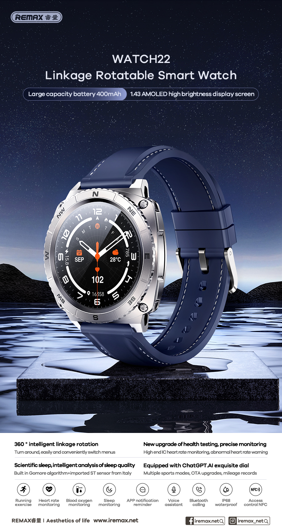 De Remax WATCH22 is een AI smartwatch met ingebouwde Chat GPT, 1,43″ AMOLED-scherm, IP68 waterbestendigheid en gebarenbediening. 400mAh batterij, 5–7 dagen gebruiksduur. Kleur: Tarnish.