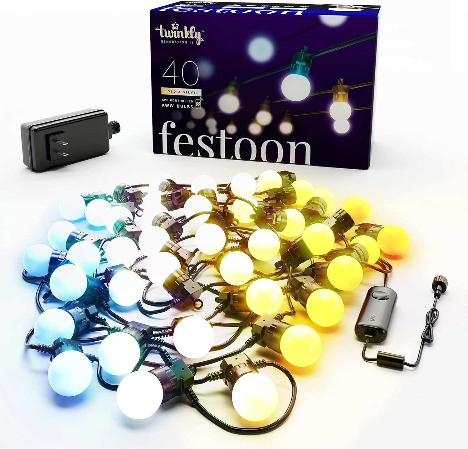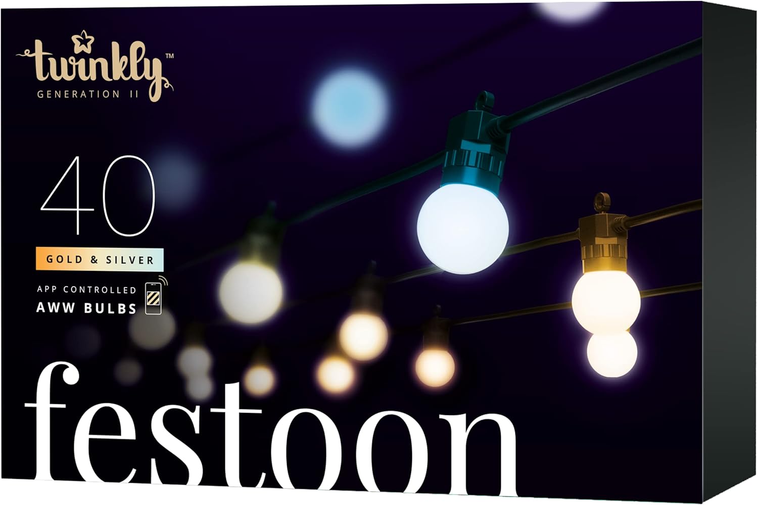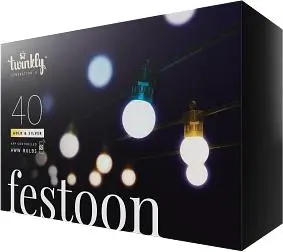 De Twinkly Festoon 40 AWW LED (20m) is een slimme feestverlichting met 40 sfeervolle bolletjes in warm-tot-wit (AWW) LED op 20 meter snoer. App-gestuurd via Bluetooth + WiFi. Ideaal voor tuinen, terrassen en feesten.