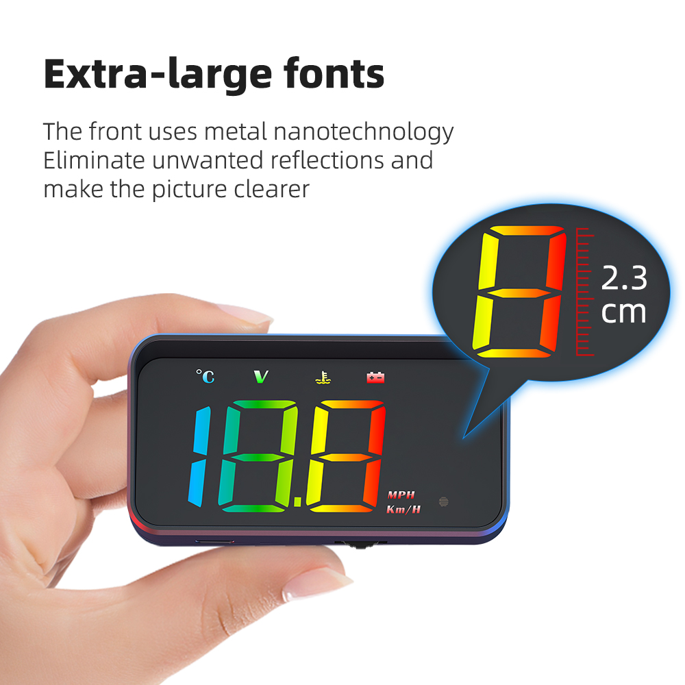 De Adaptive Light-sensing Auto Head Up Display biedt heldere achtergrondverlichting, zowel overdag als ’s nachts, zonder verblinding voor een optimale zichtbaarheid tijdens het rijden. Met dit multifunctionele display kunt u eenvoudig uw voertuigsnelheid, watertemperatuur, spanning en kilometerstand in de gaten houden.